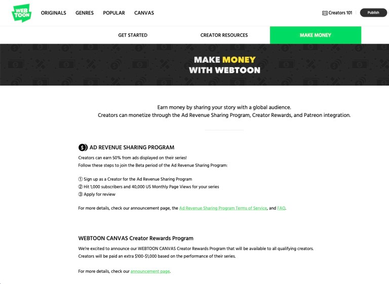With their ad revenue program you can earn money by just sharing your webtoon on their platforms.